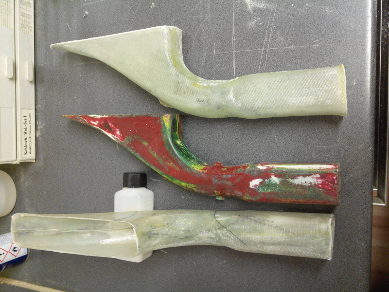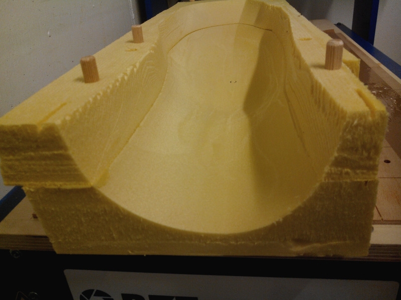 Sodele, hat zwar lange gedauert, aber die eigentlichen Formen sind fertig. Letztendlich hab ich die Form aufgefräst, das MDF einfach am Stück rausgeholt und die Form wieder verklebt. In der Summe sind auf den beiden Formen ca. 1 qm Laminat in Teils bis zu 10 Schichten enthalten, aber wenn man sich die Dinger anschaut überlegt man sich echt wo das hingegangen ist. Auf den Bildern erkennbar ist noch der Schnitt, aber ist schon sehr schön mit Harz aufgefüllt. Spachteln werde ich müssen, aber da die Form eh noch mit viel Übermaß gemacht wurde wird die erst eingebaut, dann gekürzt und dann erst gespachtelt.