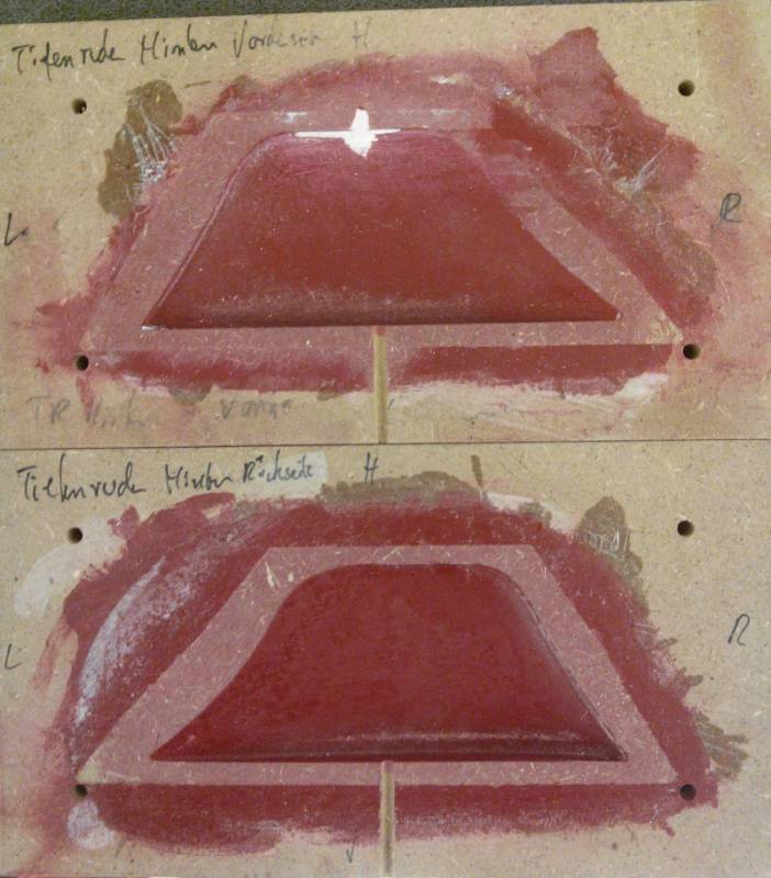 Sodele, hat zwar lange gedauert, aber die eigentlichen Formen sind fertig. Letztendlich hab ich die Form aufgefräst, das MDF einfach am Stück rausgeholt und die Form wieder verklebt. In der Summe sind auf den beiden Formen ca. 1 qm Laminat in Teils bis zu 10 Schichten enthalten, aber wenn man sich die Dinger anschaut überlegt man sich echt wo das hingegangen ist. Auf den Bildern erkennbar ist noch der Schnitt, aber ist schon sehr schön mit Harz aufgefüllt. Spachteln werde ich müssen, aber da die Form eh noch mit viel Übermaß gemacht wurde wird die erst eingebaut, dann gekürzt und dann erst gespachtelt.
